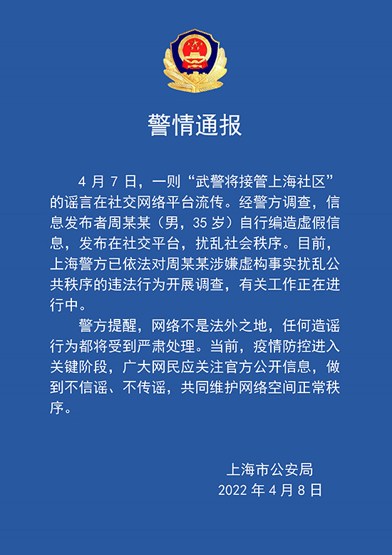 人民網上海4月8日電(王文娟)據上海市公安局通報:4月7日,一則“武警將接管上海社區”的謠言在社交網絡平台流傳(chuan) 。經警方調查,信息發布者周某某(男,35歲)自行編造虛假信息,發布在社交平台,擾亂(luan) 社會(hui) 秩序。目前,上海警方已依法對周某某涉嫌虛構事實擾亂(luan) 公共秩序的違法行為(wei) 開展調查,有關(guan) 工作正在進行中。