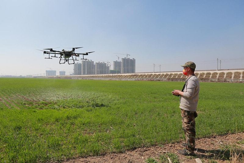“2022年,我們(men) 合作社種植了3000畝(mu) 小麥,為(wei) 加強田間管護,我們(men) 與(yu) 農(nong) 時賽跑,用科技助力糧食豐(feng) 產(chan) 豐(feng) 收。通過推廣使用植保無人機作業(ye) ,大大提高了田間管護效率。根據提前設定好的飛行速度、作業(ye) 軌跡,植保無人機就會(hui) 按設定程序開展作業(ye) 。當前植保無人機一天作業(ye) 麵積能達到600畝(mu) 。”豐(feng) 田種植專(zhuan) 業(ye) 合作社負責人王少錁說。