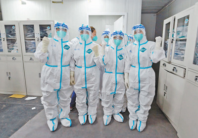 4月8日晚,隨著海南省援滬醫療隊近百名醫護人員的進駐,上海嘉定南翔方艙醫院正式投入運行。圖為(wei) 醫護人員在入艙前加油鼓勁。