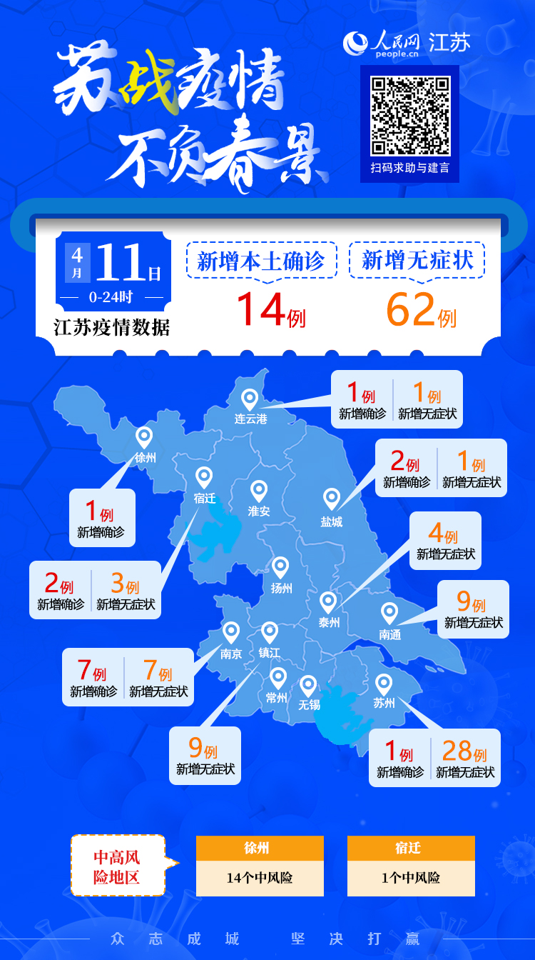 4月11日江蘇新增本土確診病例14例 本土無症狀感染者62例