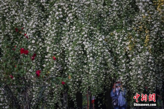 4月11日,南京玄武湖畔木香花盛放,團團簇簇的花朵從(cong) 高處“傾(qing) 瀉”而下猶如“瀑布”。圖為(wei) 市民在木香花下拍照。 中新社記者 泱波 攝