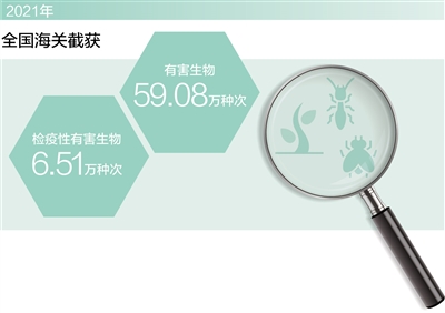 據統計,2021年,全國海關(guan) 截獲有害生物59.08萬(wan) 種次、檢疫性有害生物6.51萬(wan) 種次,首次檢出致死粒線蟲、鈴蘭(lan) 短體(ti) 線蟲、北美齒小蠹等危險性有害生物,有效防止紅火蟻、高致病性禽流感等重大動植物疫情疫病傳(chuan) 入,退回、銷毀不合格農(nong) 產(chan) 品584批。