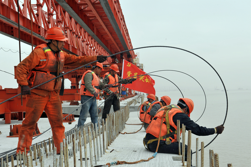 黨(dang) 員先鋒突擊隊在魚山大橋建設現場。舟山市委組織部供圖