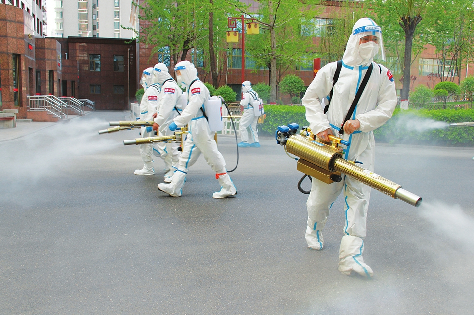 4月12日,在小店區千禧學府苑小區,太原市應急管理綜合行政執法支隊的消殺隊員們(men) 正在消殺。隨後他們(men) 來到西吳村社區、丁香園、恒大綠洲、長風小區等居民住宅區,對所有樓棟、垃圾點及室外公共區域等進行全麵消殺,牢牢築起健康防線。(記者尤麗(li) 雲(yun) 攝)
