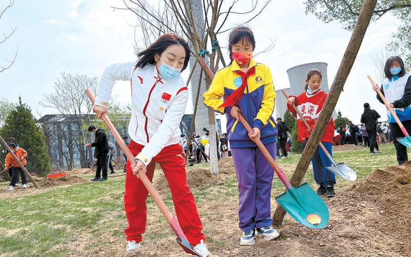 冬奧冠軍(jun) 隋文靜與(yu) 石景山的青少年一起參與(yu) 植樹活動。 本報記者 吳鏑攝