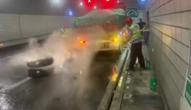 22點3分,巡查員通過對向隧道的汽通門第一時間進入現場,施救人員從(cong) 同向到達現場,一次“雙向奔赴”的救火就此展開。一名巡查員與(yu) 施救人員緊密配合,拿出水槍,對著起火點進行滅火。不出2分鍾,起火點的明火被熄滅,但是溫度還是很高,需要不斷澆水才能阻止輪胎複燃。另一名巡查員則將司機帶離到安全地帶,隨後又將車道上的雜物清理至緊急停車帶,以便解除卡口後為(wei) 後續車輛提供一個(ge) 安全的行車環境。22點23分,車道恢複暢通。