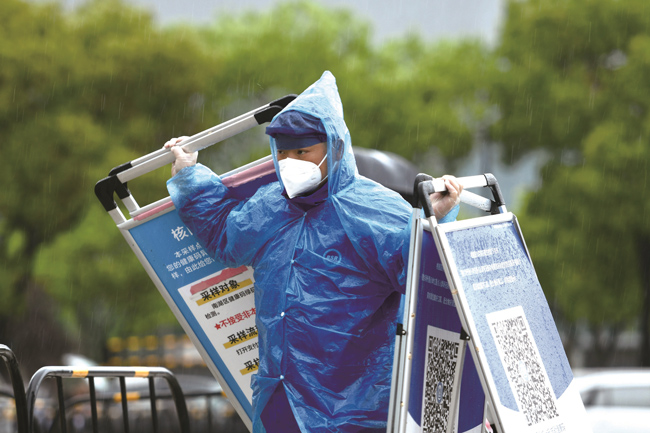 4月13日,在嘉興(xing) 市區三元路上的新嘉街道核酸采樣點,來自嘉興(xing) 藍天救援隊的誌願者們(men) 在大雨中堅守,協助完成核酸采樣。(王振宇)