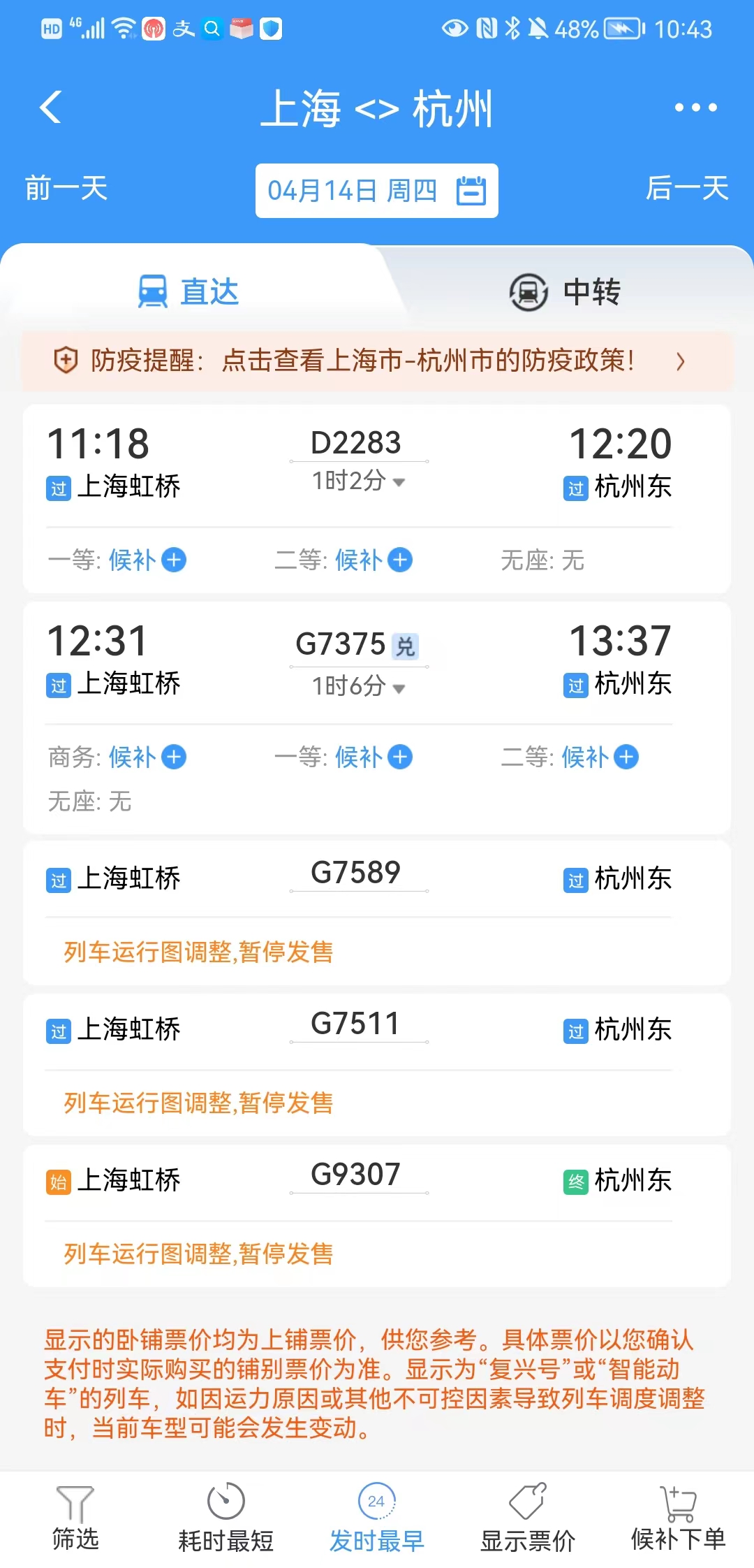 以查詢4月14日上海-杭州的火車票為(wei) 例,僅(jin) 剩的5趟列車中,D2283、G7375隻是從(cong) 上海虹橋站經過,車票售罄是因為(wei) 買(mai) 票的幾乎都是別的城市上車的旅客,實際從(cong) 虹橋站上車的旅客幾乎沒有;另外兩(liang) 趟在上海虹橋站的過路車(G7589、G7511)和一趟始發車(G9307)幹脆已暫停發售車票,更不存在大量上海出發旅客買(mai) 票的可能。
