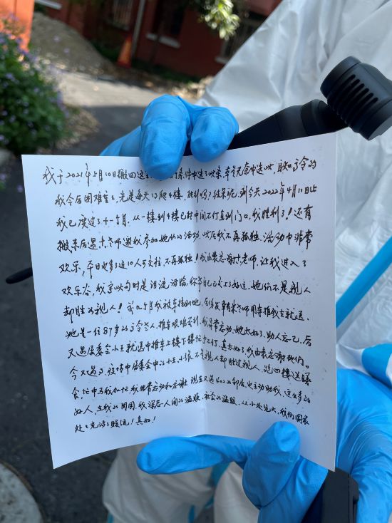 幾經推辭,錢留在老人家手裏,但她還執拗地遞來兩(liang) 封信,一封短的,本來包鈔票用的:這是給您們(men) 和廣大誌願者添些營養(yang) 品用,望勿拒。還有封長信裏提到,“疫情中,居委會(hui) 的小王、小張,不是親(qin) 人卻勝過親(qin) 人,跑四樓送膳食,我非常感謝。”