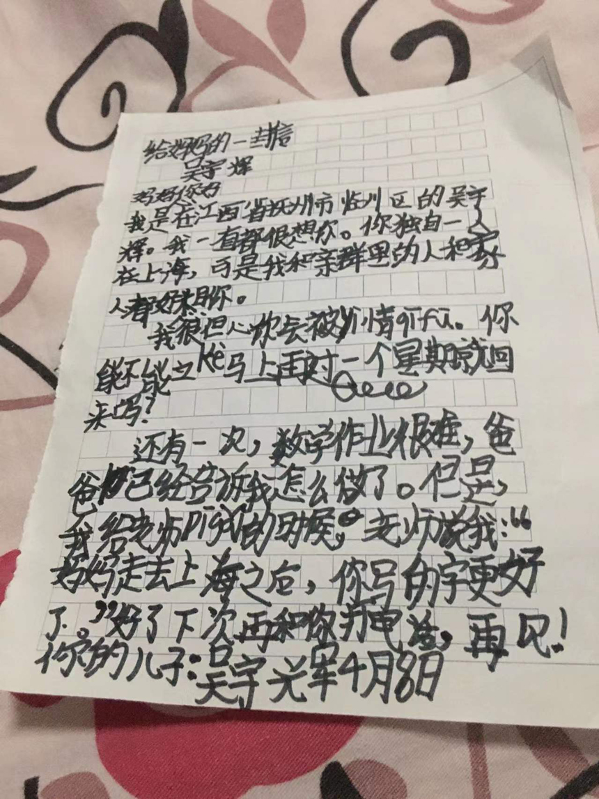 兒(er) 子吳宇輝寫(xie) 給媽媽張衝(chong) 華的信。受訪者供圖