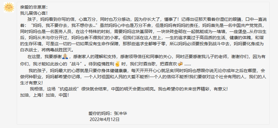 “一個人的信仰不能丟” 援滬護士淩晨給兒子寫下一封家書