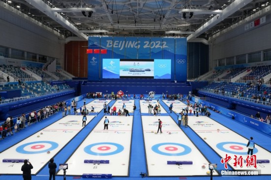 4月16日,北京,民眾(zhong) 在國家遊泳中心體(ti) 驗冰壺運動。當日,國家遊泳中心重新麵向公眾(zhong) 開放,並開啟冬奧文化大眾(zhong) 體(ti) 驗季,民眾(zhong) 可在冬奧會(hui) 原有設施、燈光、大屏、景觀等環境下,感受冬奧和冰壺文化的氛圍。中新社記者 崔楠 攝