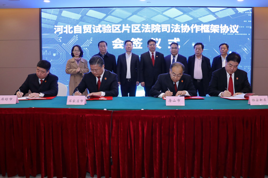 河北自貿試驗區片區法院司法協作框架協議會(hui) 簽儀(yi) 式現場。 張亞(ya) 寧攝