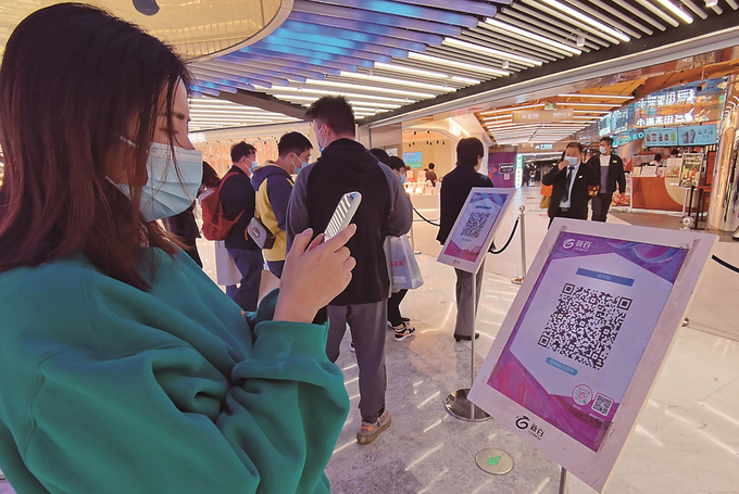 昨日,記者在南京新街口一大型購物中心入口處看到,印有“場所碼”的告示牌非常醒目,工作人員提醒市民進入需掃描場所碼。 本報記者 宋寧 攝