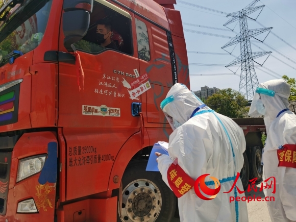 工作人員對外來貨車及駕乘人員進行信息登記。人民網記者 王繼亮攝