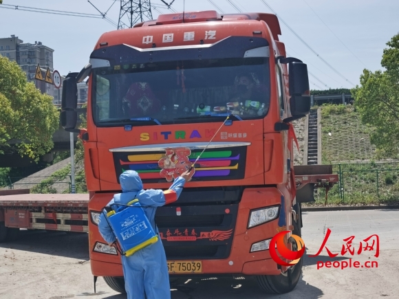 疫情防控人員對外來貨車進行消殺。人民網記者 王繼亮攝