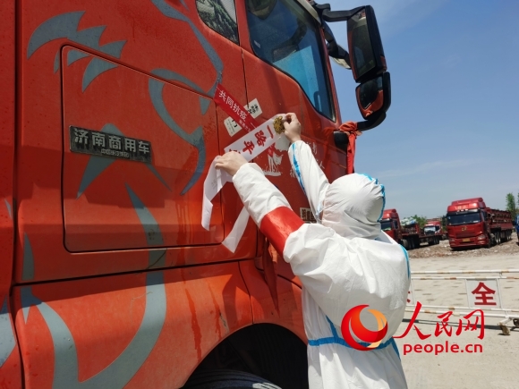 工作人員為(wei) 外來貨車貼上封條。人民網記者 王繼亮攝