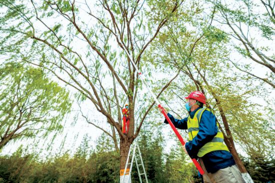 通州大運河森林公園裏,園林養(yang) 護人員用高枝鋸修剪細枝。本報記者 潘之望攝