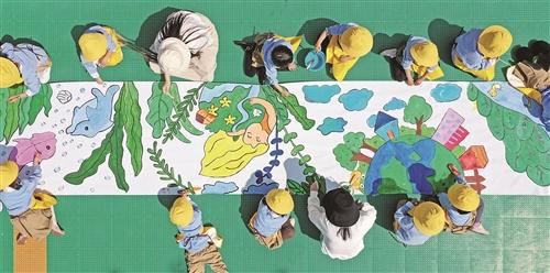 4月21日,台州仙居縣幼兒(er) 園的孩子們(men) 在老師指導下創作珍愛地球主題繪畫作品。當日,幼兒(er) 園開展以“珍愛地球 人與(yu) 自然和諧共生”為(wei) 主題的教育活動,迎接“世界地球日”到來。通過繪長卷、環保時裝秀、垃圾分類等教育活動,引導孩子們(men) 愛護環境,共同守護地球母親(qin) 。