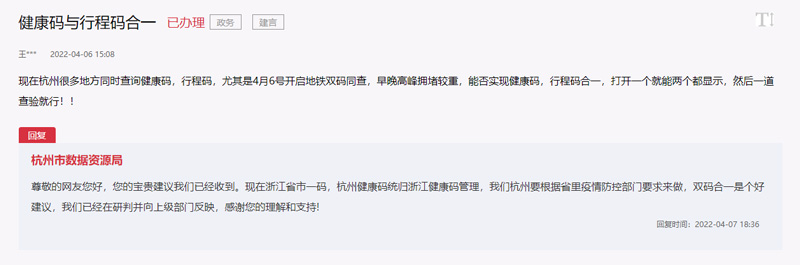 麵對網友的建言,杭州市數據資源局工作人員回複,現在浙江省市一碼,杭州健康碼統歸浙江健康碼管理,杭州要根據省裏疫情防控部門要求來做,並表示雙碼合一是個(ge) 好建議,已經在研判並向上級部門反映。
