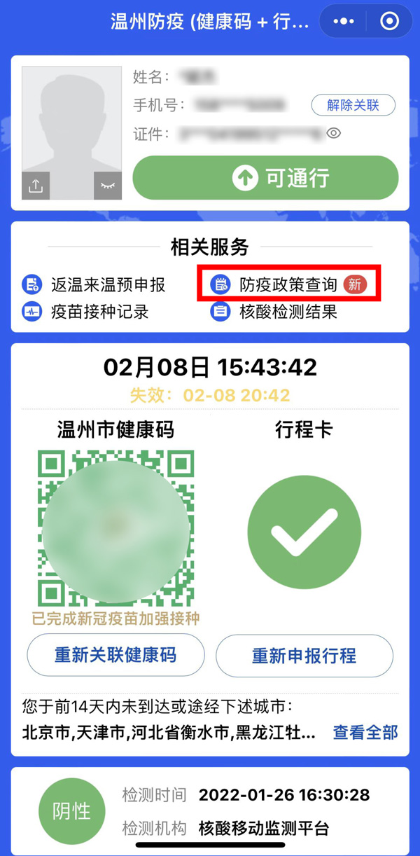 其實,在浙江省溫州市推出的溫州防疫碼小程序中,就已經實現了健康碼與(yu) 行程卡在同一界麵顯示,還融合了返溫來溫預申報、防疫政策查詢、核酸檢測結果等相關(guan) 服務,受到市民的好評。