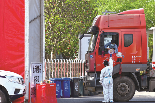 4月21日,在嘉興(xing) 市嘉善縣天凝高速出入口,交警正在核驗過往司乘人員的健康碼、行程卡、核酸檢測報告和有無途經中高風險地區等信息,築牢疫情防線,保障物流安全暢通。(張啟帆)