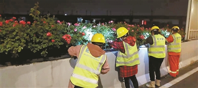 春季苗木生長迅速,水分需求量大,每天夜間22點到翌日淩晨2點,就是月季喝水的“黃金4小時”。為(wei) 了確保月季“喝好水”,養(yang) 護團隊根據天氣情況對供水時間進行加減微調,同時加大對滴管、滴劍等附屬設施檢修。