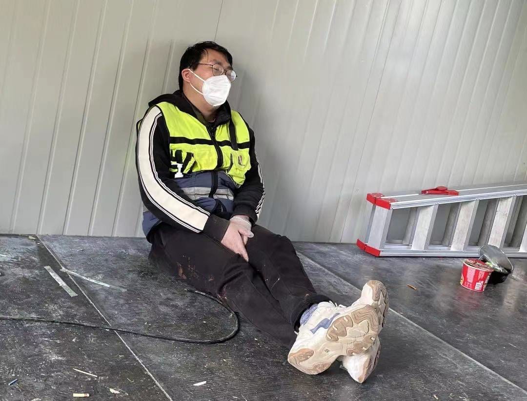 “3月底的上海,還有點冷,沒有被子蓋,我們(men) 就裹著衣服,每天隻能睡不超過兩(liang) 小時。”上海建工集團副總工程師王美華是施工現場為(wei) 數不多的女性。現場24小時不停工,工人兩(liang) 班倒,交班後就地鋪板睡覺,但應急指揮部管理人員要隨時待命,解決(jue) 現場各類問題,隻能找間隙蜷縮在車裏休息一下。
