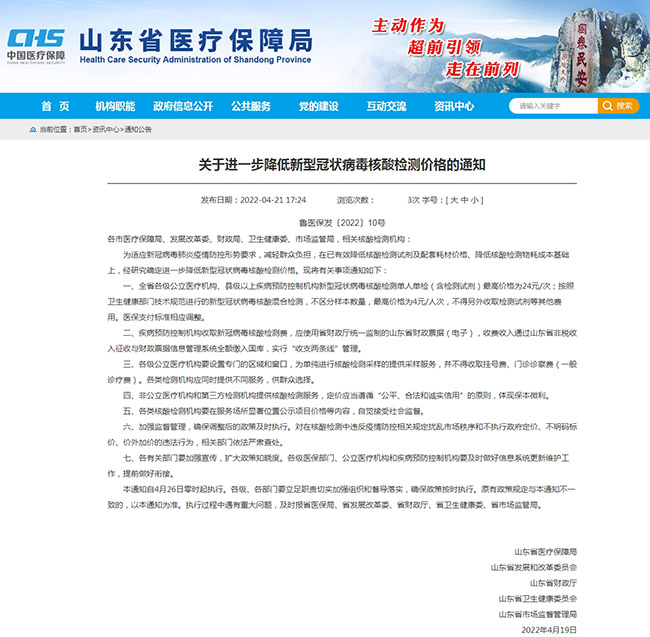 人民網濟南4月22日電(聶俊穹)21日,山東(dong) 省醫保局、省發改委、省財政廳、省衛生健康委、省市場監管局等五部門聯合印發文件,自2022年4月26日零時起,進一步降低新型冠狀病毒核酸檢測價(jia) 格。