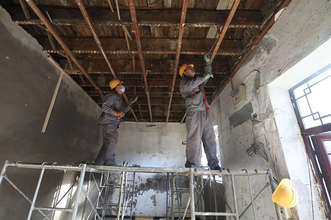 按照計劃,樓頂將由原來的木質大屋脊整體(ti) 更換為(wei) 樹脂瓦阻燃屋麵。而在第一階段改造中,樓體(ti) 阻燃,為(wei) 居民量身訂製燃氣櫃,配備24小時巡護“管家”,每天進行巡查記錄並拍攝現場照片均已完成。一層的臨(lin) 街房屋內(nei) 的夾層已經拆除完畢,木製窗已經更換為(wei) 塑鋼窗,原來的薄牆麵上加裝矽酸鈣板,地麵鋪設了耐火地板磚,屋頂吊裝了石膏板。二層樓內(nei) 木樓板已鋪設耐火瓷磚,樓內(nei) 電線電纜進行了梳理排查,完成了整體(ti) 更換,鋪設了不鏽鋼槽式電纜橋架,確保樓內(nei) 居民用電安全穩定。
