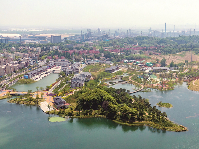 自二〇二一年起,南京啟動幸福河湖建設行動,截至目前,十七條幸福河湖已經建成。圖為(wei) 昨日航拍的南京桃湖公園。 本報記者 陳儼(yan) 攝