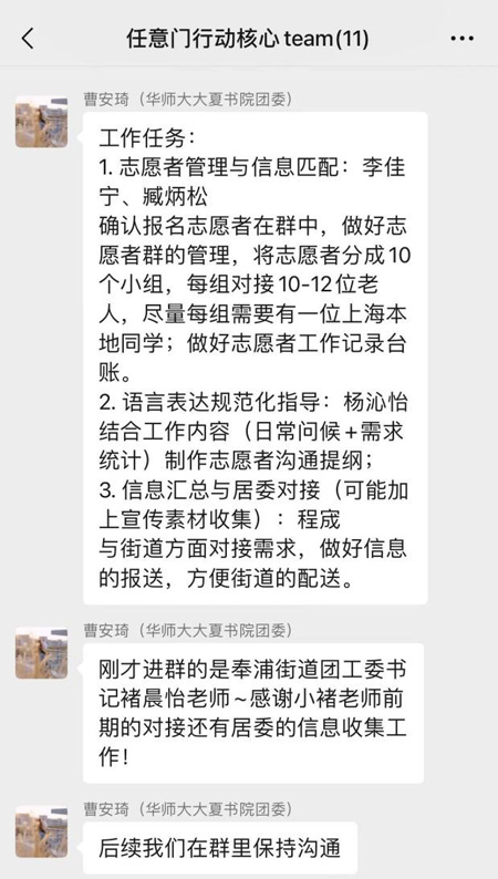 項目啟動當晚,合作雙方即建立行動核心team微信群,大夏書(shu) 院誌願者總隊和小區在地誌願者小分隊也同步建立子微信群,統一行動指南,明確責任分工,過濾重複信息,提高老年人緊急需求的處置效率。