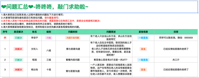 大學生誌願者團隊負責人之一、2018級漢語言文學專(zhuan) 業(ye) 本科生李佳寧,設計了共享文檔,用於(yu) 發布活動通知、匯總聯絡情況、提供答疑互助,為(wei) 誌願者團隊線上管理過程中的工作信息高效互通提供有利保障。符合青年學生信息溝通習(xi) 慣的聯絡方式,得到了誌願者成員的一致認同,陸續被充實的一條條聯絡記錄和心得體(ti) 會(hui) ,架起了老年人“數字鴻溝”的橋梁。