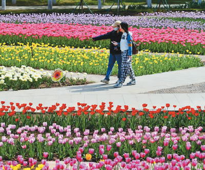 遊客在河北省石家莊市植物園觀賞鬱金香。張曉峰攝(人民圖片)