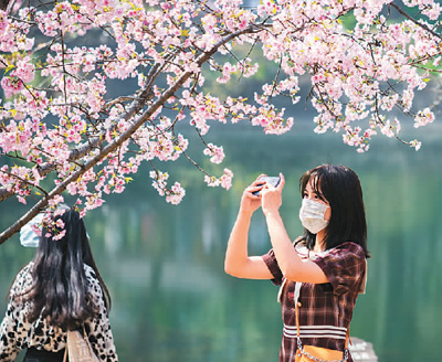 遊客在江蘇省南京市中山植物園賞花拍照。蘇 陽攝(新華社發)