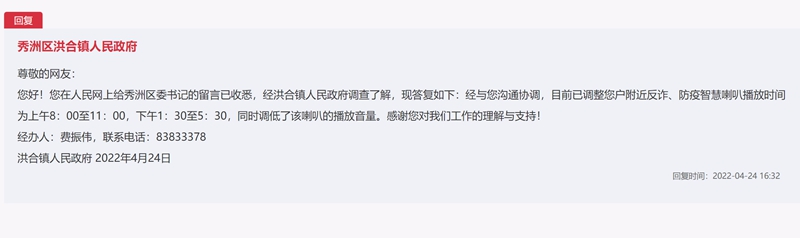 秀洲區洪合鎮人民政府對此高度重視,並於(yu) 4月24日進行了回應,並回複稱,經洪合鎮人民政府調查了解,已與(yu) 徐女士進行了溝通協調,目前已將徐女士所住小區附近的反詐、防疫智慧喇叭的播放時間調整為(wei) 上午8:00至11:00,以及下午1:30至5:30,同時調低了該喇叭的播放音量。
