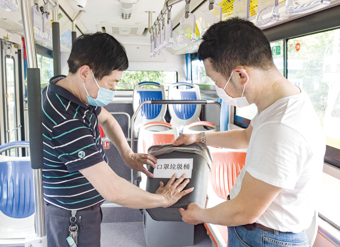4月26日,金華市區公交南站,工作人員在公交車上設置廢棄口罩專(zhuan) 用垃圾桶。為(wei) 防止廢棄口罩造成二次汙染,相關(guan) 單位在各大公交樞紐站點設置了口罩回收專(zhuan) 用垃圾桶,用於(yu) 回收和妥善處理廢棄口罩。同時,在一些開往農(nong) 村的公交車上設置廢棄口罩專(zhuan) 用垃圾桶。每一趟車到達終點站時,司乘人員都會(hui) 進行規範清理,以減少疫情傳(chuan) 播風險。(李建林)