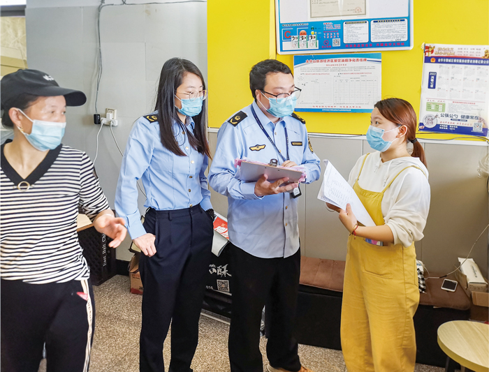 4月26日,金華婺城區市場監管局羅店所工作人員來到轄區內(nei) 餐飲經營戶檢查複工複產(chan) 情況,並提示商戶落實上級防疫相關(guan) 規定。羅店鎮由管控區調整為(wei) 防範區後,該所加強對轄區餐飲經營戶的巡查,要求商戶督促顧客掃防疫碼,檢查店內(nei) 食品原料及預包裝食品的保質期、消毒日期,及時清理臨(lin) 保過保的食品等,實現轄區餐飲行業(ye) 有序複工複產(chan) 。(吳潮宏)