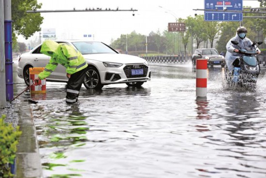 4月26日,在嘉興(xing) 市區中山西路,因短時暴雨造成部分路段臨(lin) 時積水,來自周邊企業(ye) 的誌願者堅守在大雨中清除路麵積水,保障過往車輛及行人的交通安全。(馮(feng) 玉坤)
