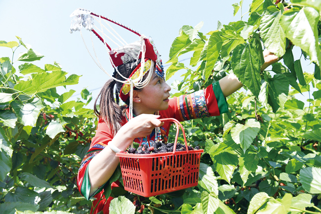 4月24日,金華市武義(yi) 縣桃溪鎮錦平村內(nei) ,身著佘族服飾的村民們(men) 正在采摘桑椹。通常,桑椹采摘到5月中旬結束,每年能帶動村集體(ti) 增收7萬(wan) 元左右。據了解,該村積極發展桑椹種業(ye) ,帶動村民參與(yu) 采摘,並對桑椹進行桑椹酒、桑椹果幹等產(chan) 品開發,增加附加值,讓村民增收致富。(章陳波、朱翬)