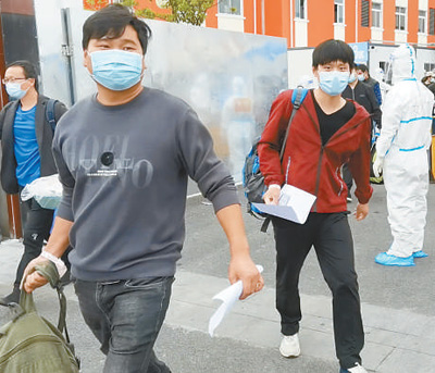 一個(ge) 小時後,大巴停在閔行區浦江鎮談連方艙醫院門口。200多名康複者背著大包小包,已經在院子裏排隊,經工作人員指引依次登記出艙。