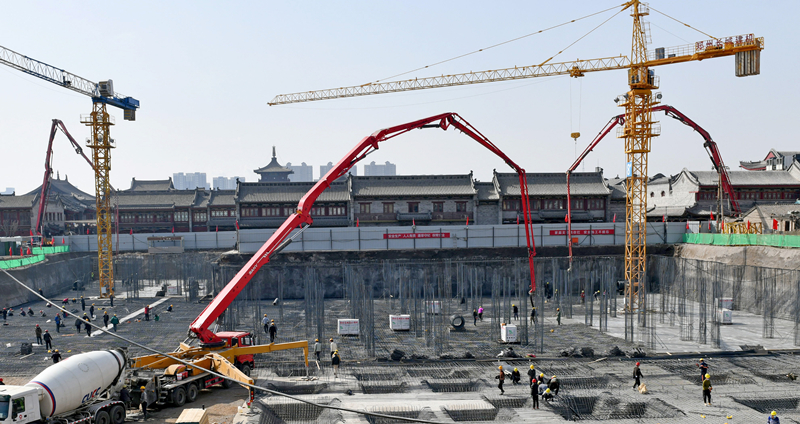 4月10日,大同古城戶部角綜合文旅項目工地上,機器轟鳴。大同市統籌經濟社會(hui) 發展和疫情防控工作,在落實各項防疫措施的同時,複工複產(chan) 也在緊張進行中。李冬賓 攝