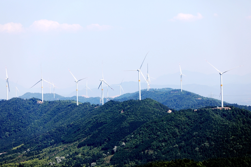 人民網南昌5月6日電 2022年5月5日,在江西省吉安市峽江縣羅田鎮玉峽風力發電場,一台台風力發電機矗立在群山之巔。據悉,該風力發電廠共有36台風力發電機組成,裝機容量達82兆瓦,年發電量1.559億(yi) 度。