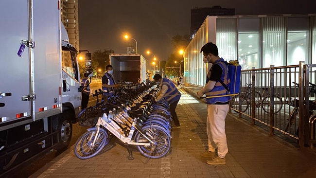 哈囉單車北京團隊負責人胡濤介紹,近期團隊臨(lin) 時增加42名運維人員和12輛調度車輛投入抗疫保障行動。對每輛共享單車在出庫、入庫、調運等環節中實施100%消毒,在重點景區、商圈、寫(xie) 字樓以及北京站、王府井、崇文門、望京等軌道交通站點,每日分早中晚三個(ge) 時段進行無差別消殺。