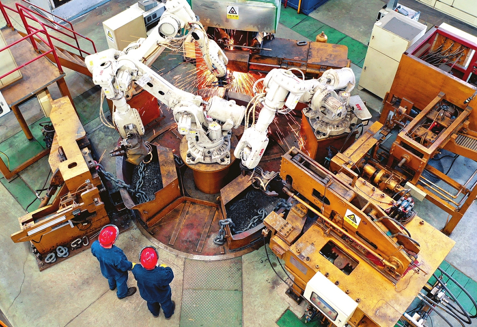 5月5日,在晉能控股裝備製造集團華越華茂公司生產(chan) 車間,國內(nei) 首套國產(chan) 化礦用高強度圓環鏈全自動製鏈機組正在作業(ye) 中。近年來,該公司不斷提升裝備能力,其生產(chan) 的礦用高強度圓環鏈、緊湊鏈及各類工業(ye) 用鏈條,工藝達到國內(nei) 領先水平。(記者劉通攝)