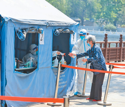 5月4日,北京西城區什刹海街道荷花市場核酸檢測現場,工作人員引導老人通過綠色通道進行核酸檢測。什刹海街道優(you) 化點位設置,減少排隊時間。同時特別關(guan) 注老人、兒(er) 童等群體(ti) ,為(wei) 他們(men) 開辟綠色通道,進一步提高采樣工作效率。
