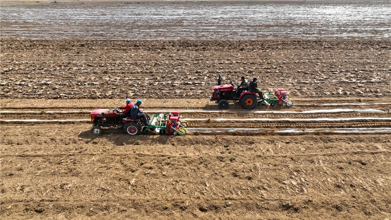 朔城區南榆林鄉(xiang) 青鍾村玉米核心區播種現場,應用了膜側(ce) 播種技術的播種機在田間播種作業(ye) 。高文武 攝