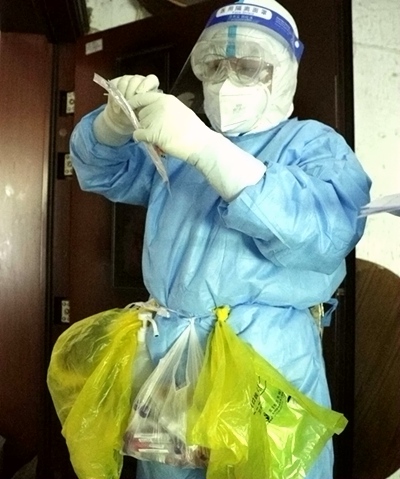 5月2日早上9點不到,劉彩麗(li) 來到小區門口,穿戴好防護服,腰上綁好采樣工具包、消毒用具,進入封控區為(wei) 居民進行核酸采樣。小區是5層的老舊樓房,沒有電梯,裹著防護服的劉彩麗(li) 爬上頂樓時已經氣喘籲籲,倚著欄杆平穩了一下呼吸,輕輕敲著居民門,準備投入采樣工作。經過多輪核酸采樣,劉彩麗(li) 和居民早已熟稔。