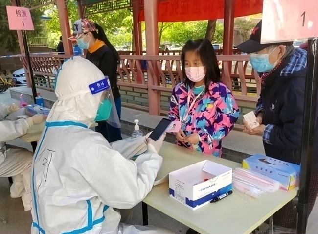 在海澱區石佛寺曙光小型消防站核酸檢測點,95後“大白”張利紅正在為(wei) 居民進行核酸采樣。此前,作為(wei) 人大幼兒(er) 園保健醫的她,已經多次參與(yu) 核酸檢測采樣工作,也一直希望能夠為(wei) 自己工作的地區做貢獻。通過單位了解到街道的核酸檢測點正在招募誌願者後,張利紅第一時間報了名,成為(wei) 了社區采樣點的一名“大白”。
