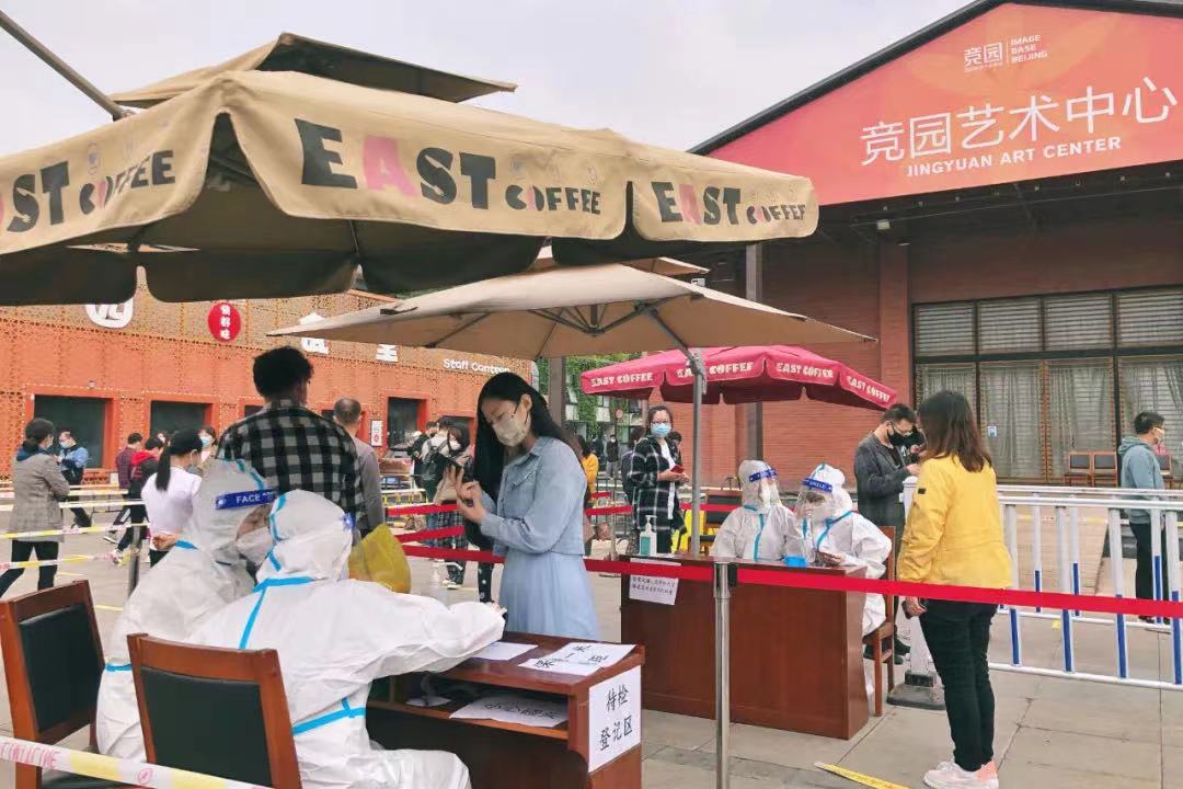 在通惠河畔文化創意產(chan) 業(ye) 園核酸檢測點,一枚枚紅色“黨(dang) 員誌願服務”袖標格外醒目。